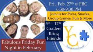 Plan to have fun if you are in 5th through 12th grade! We will have pizza, snack, games and lots of fun. Contact Pastor Bill if you would like more information @ Pastor Bill.