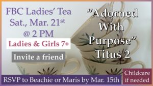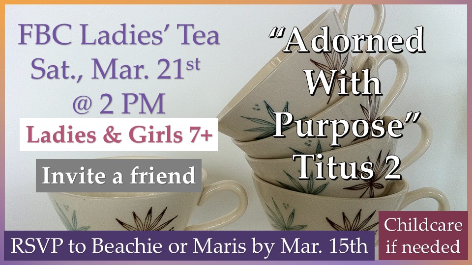 Ladies of all ages are welcome to this time of fellowship, connection, prayer, and Bible study. Come and bring a friend. Our theme for the tea is Adorned with Purpose. This event will be in the Harrison Fellowship Hall at the church. Bring a snack to share. Please RSVP by Mar 15th to Beachie Steinman or Maris Martyn.