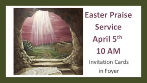 Join us on Easter Sunday as we celebrate the Resurrection of our Lord and Savior Jesus Christ. This service will be at a special time-10 AM. We will not have Sunday School, but there will be Children’s Church during the message time. We will also have Communion. Invite others to join you.