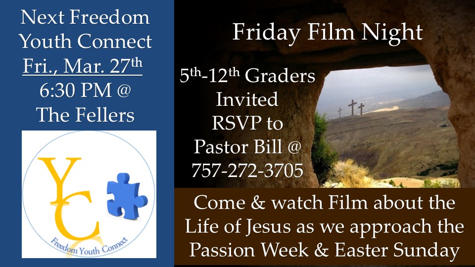 5th thru 12th graders are invited to come and watch a film about the life of Jesus at the home of a church family as we approach the Passion Week & Easter Sunday. Invite your friends and bring a snack to share. To get more details or to RSVP, contact Pastor Bill.