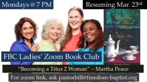 Our Ladies’ Book Club will resume Monday, Mar 23 at 7 PM. The next book will be Becoming a Titus 2 Woman by Martha Peace. You can purchase this from Amazon as a paperback or in Kindle format. If you would like to be a part of the Book Club, please, contact – Beachie Steinman.